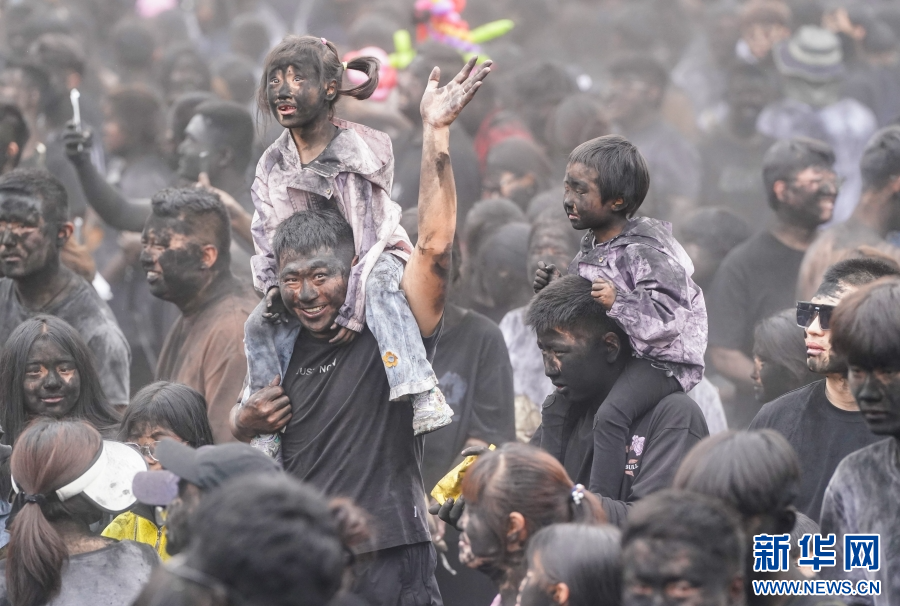 家长带着小朋友在墨江参加“抹黑脸”狂欢(5月2日摄)。新华社记者 陈欣波 摄