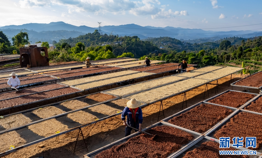 工作人员在思茅区大开河梅子咖啡庄园的咖啡晒场翻晒咖啡(无人机照片,2025年1月7日摄)。新华社记者 陈欣波 摄