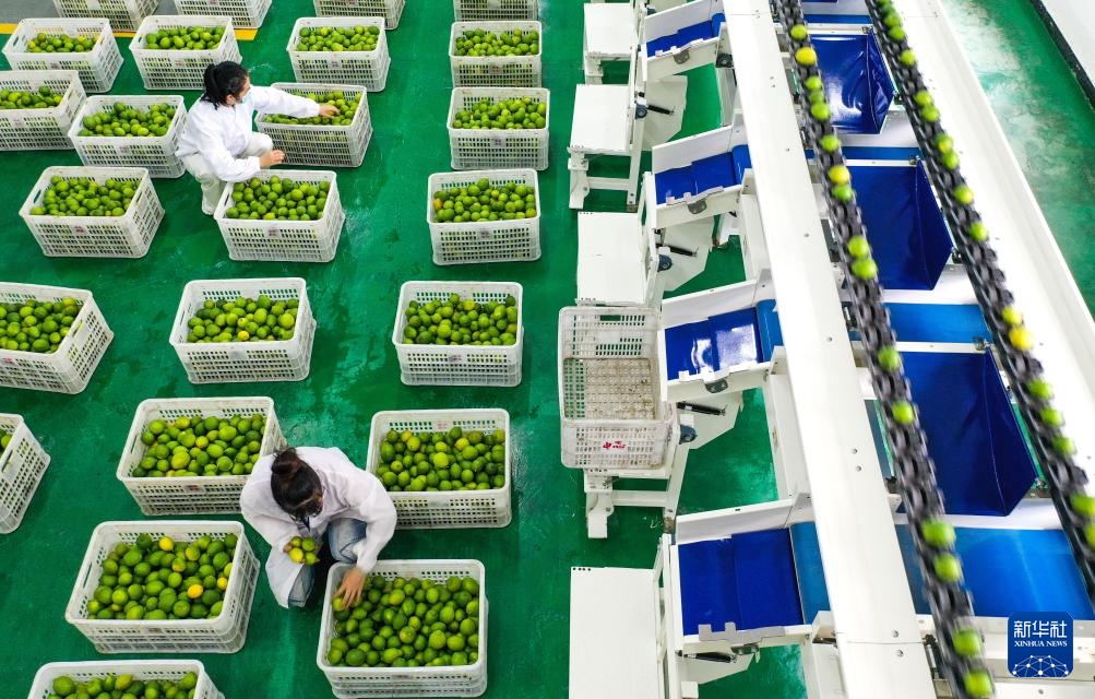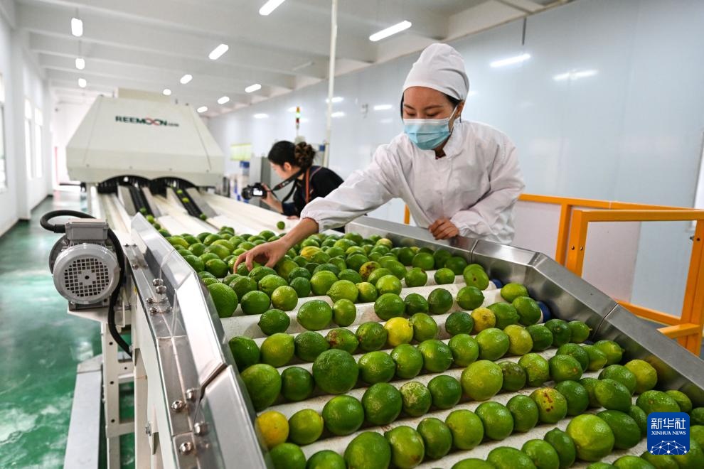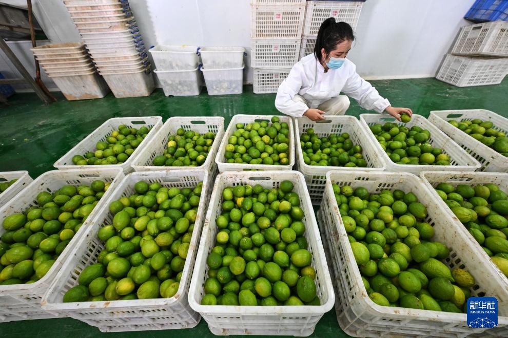 10月16日,工人在望谟县蔗香镇青柠檬现代产业园的生产车间分拣柠檬。