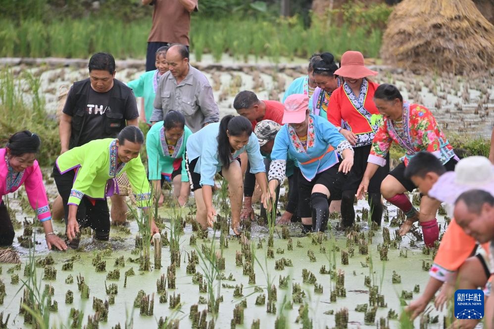 10月18日,在柳州市融水苗族自治县安太乡培秀村稻田里,村民们进行抓鱼比赛。