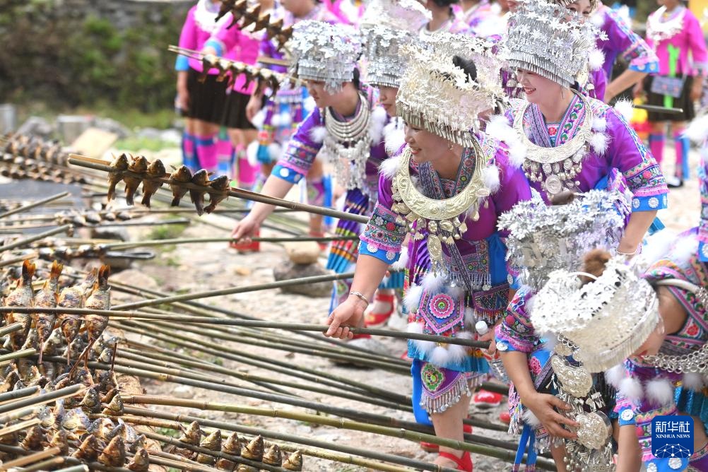 10月18日,在柳州市融水苗族自治县安太乡培秀村,村民们整理刚刚烧好的鱼。