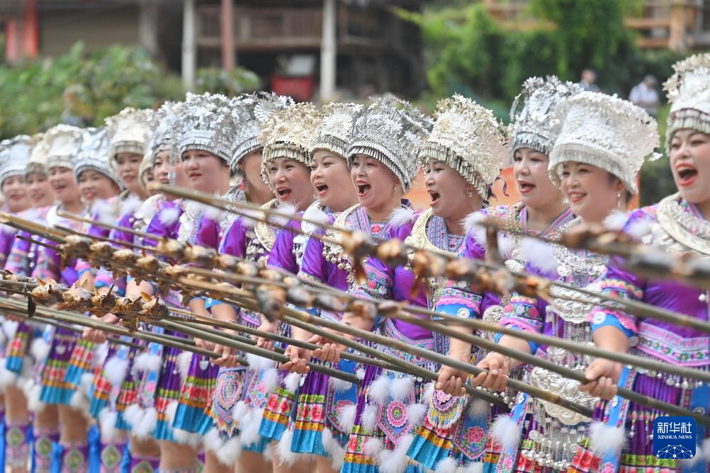 10月18日,在柳州市融水苗族自治县梦呜苗寨,村民在展示烧鱼文化。