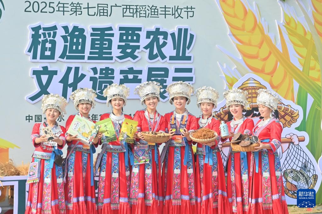 10月18日,在柳州市融水苗族自治县安太乡培秀村,村民们展示稻渔文化。