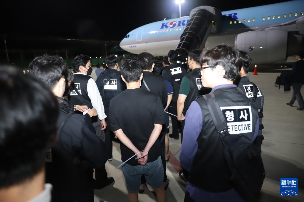10月18日凌晨,在柬埔寨金边德崇国际机场,警察押送被遣返的韩国网络诈骗嫌疑人登机。