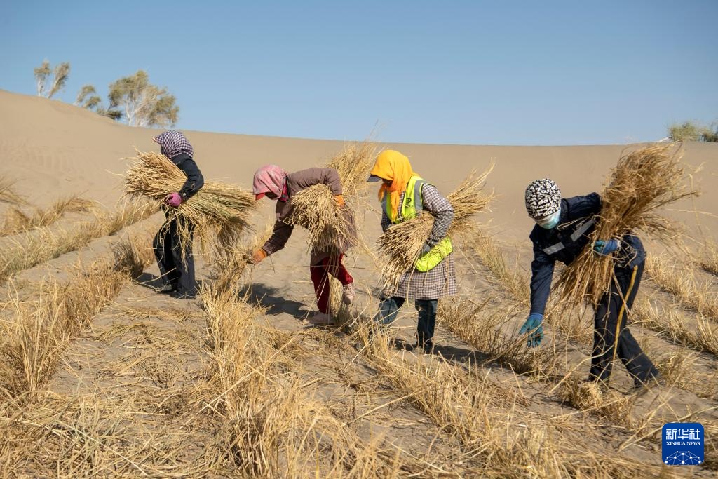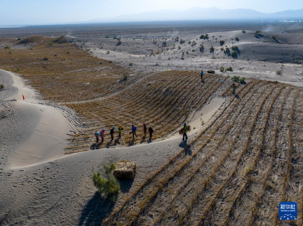 10月18日,施工人员在库姆塔格沙漠“锁边工程”项目建设现场铺设沙障。