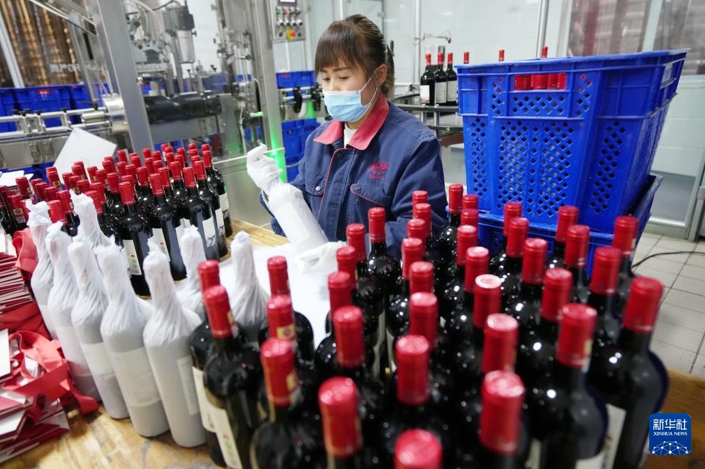 工作人员在银川市永宁县闽宁镇立兰酒庄包装葡萄酒(10月14日摄)。