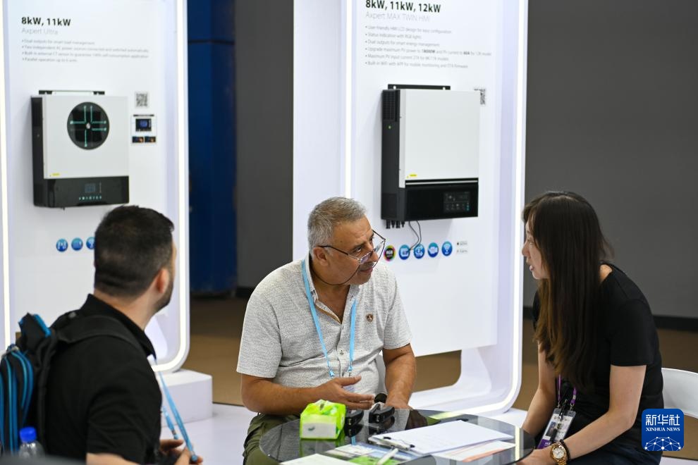 10月19日,客商与展商在第138届广交会展馆日月元科技(深圳)有限公司展台交谈。