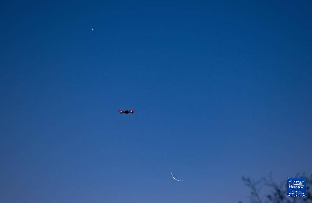 10月20日,在位于黑龙江省黑河市的北大荒集团北安分公司赵光农场有限公司,摄影爱好者在用无人机拍摄启明星伴月。