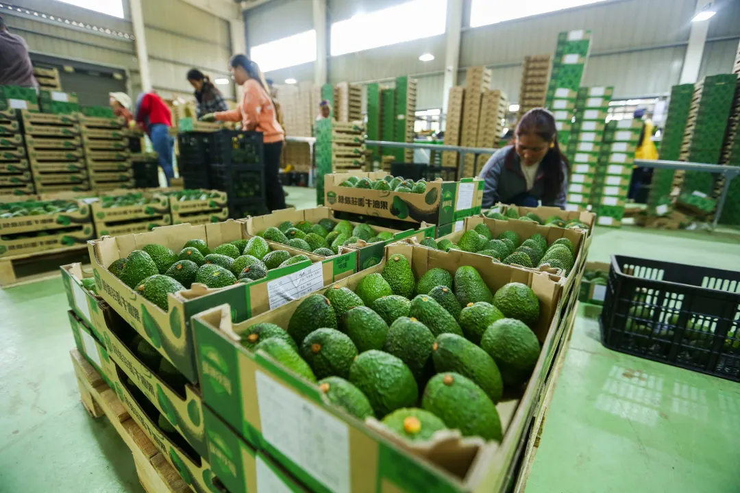 工人在中国孟连牛油果集配中心内包装分选后的牛油果。