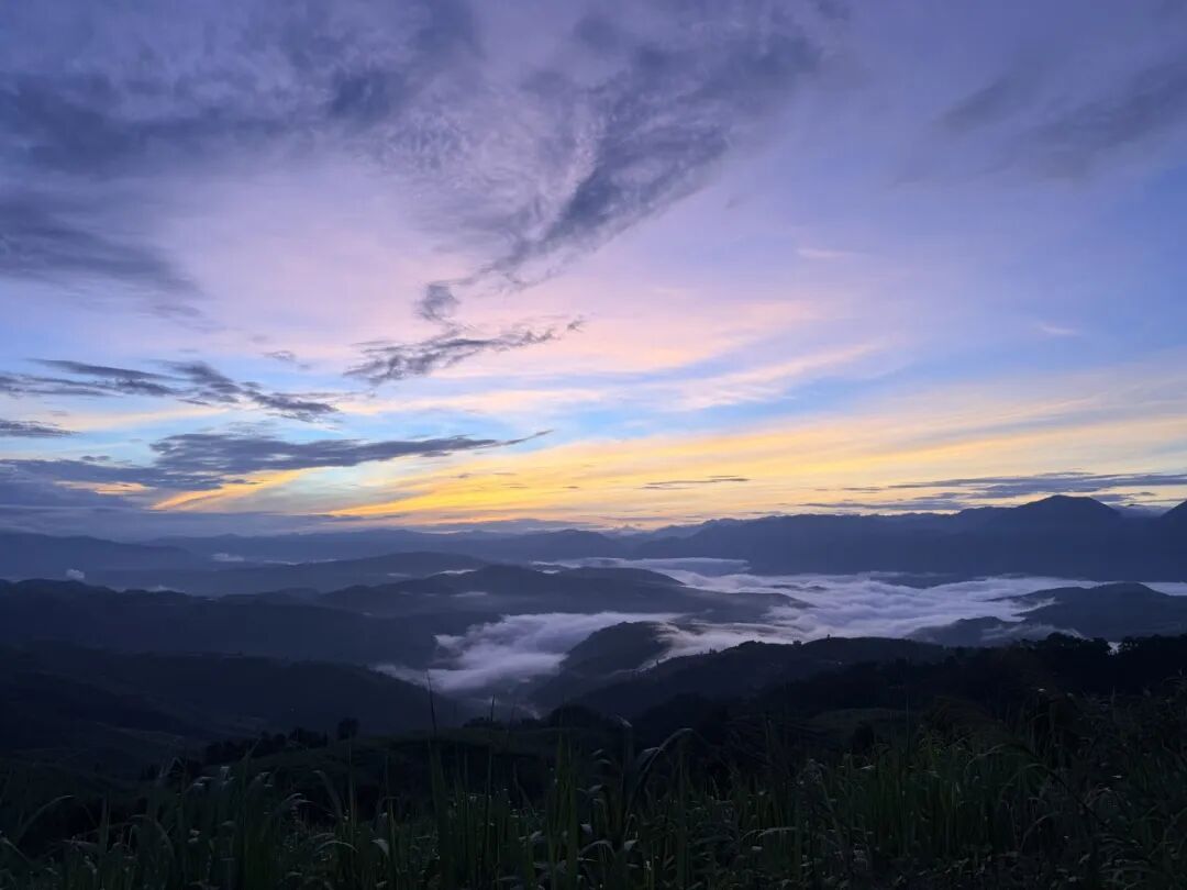 清晨时立于高坡远眺,黎明前的天空犹如水墨长卷,淡紫与浅蓝交织渐变。云絮如被晨风梳理的棉絮,悠然浮动于山谷之间——这是山林特有的高山云海,由夜雾与晨低温共同造就,它们缠绕峰峦,轻抚林梢,在青黛色山岭间铺展成一片白色海洋。