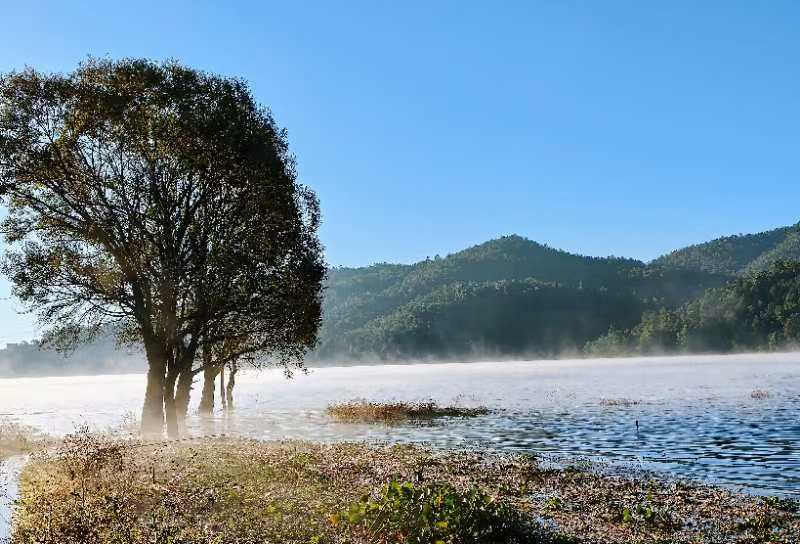 沙桥的冬景,是删繁就简的诗意。凤山湖褪去了春夏的灵动,湖面沉静如镜,薄雾氤氲时,远山与湖岸若隐若现,宛如水墨画卷。岸边的树木虽卸下了葱茏,枝条在寒风中舒展,勾勒出简洁有力的线条,偶有几片残叶挂在枝头,随风轻摇,更添几分静谧。山间的小径铺满落叶,踩上去沙沙作响,阳光透过稀疏的枝丫洒下,斑驳的光影在地面流动,冬日的清冽与暖阳的温柔在此交融,深呼吸间,满是草木与泥土的清新气息。