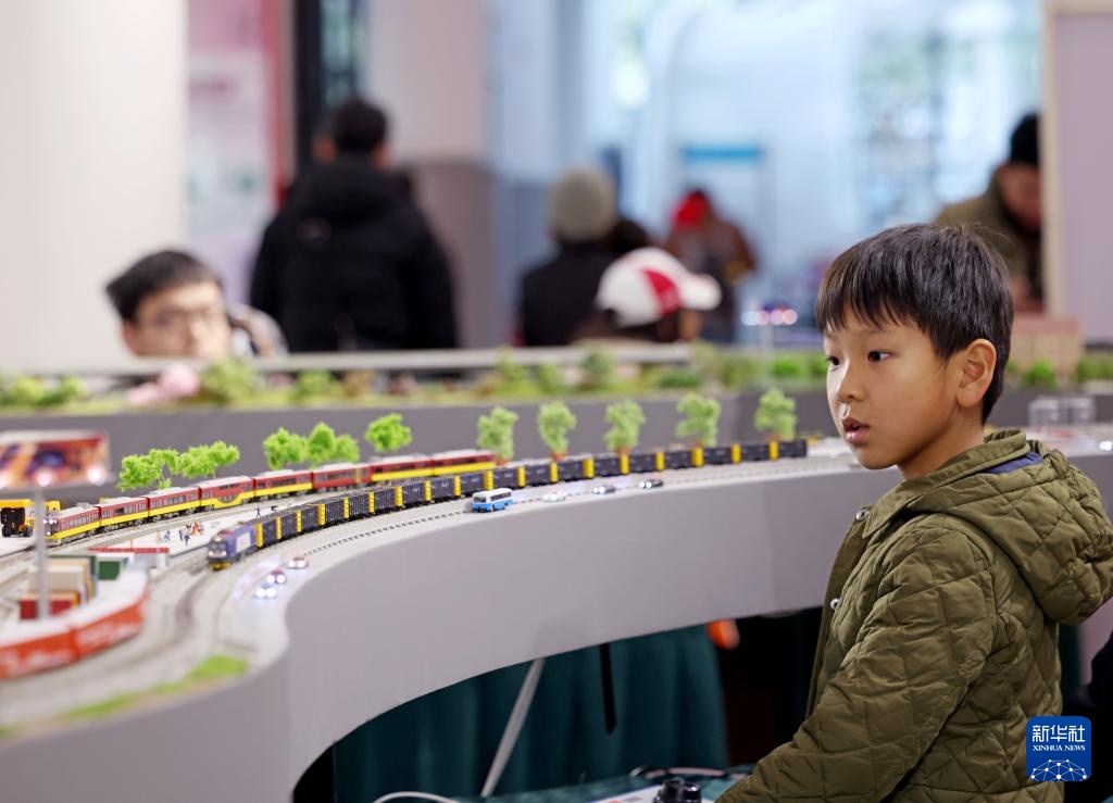 12月27日,在运转会活动上,小朋友被沙盘上的火车模型吸引。