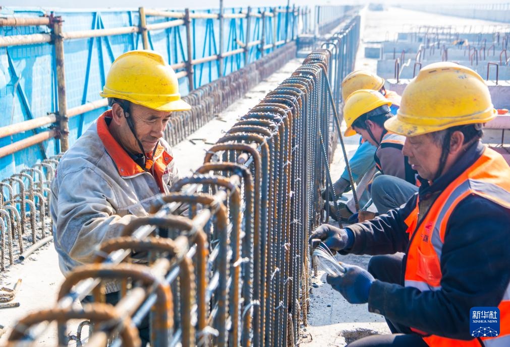 12月27日,工人在西渝高铁赵家普里河特大桥建设现场施工作业。