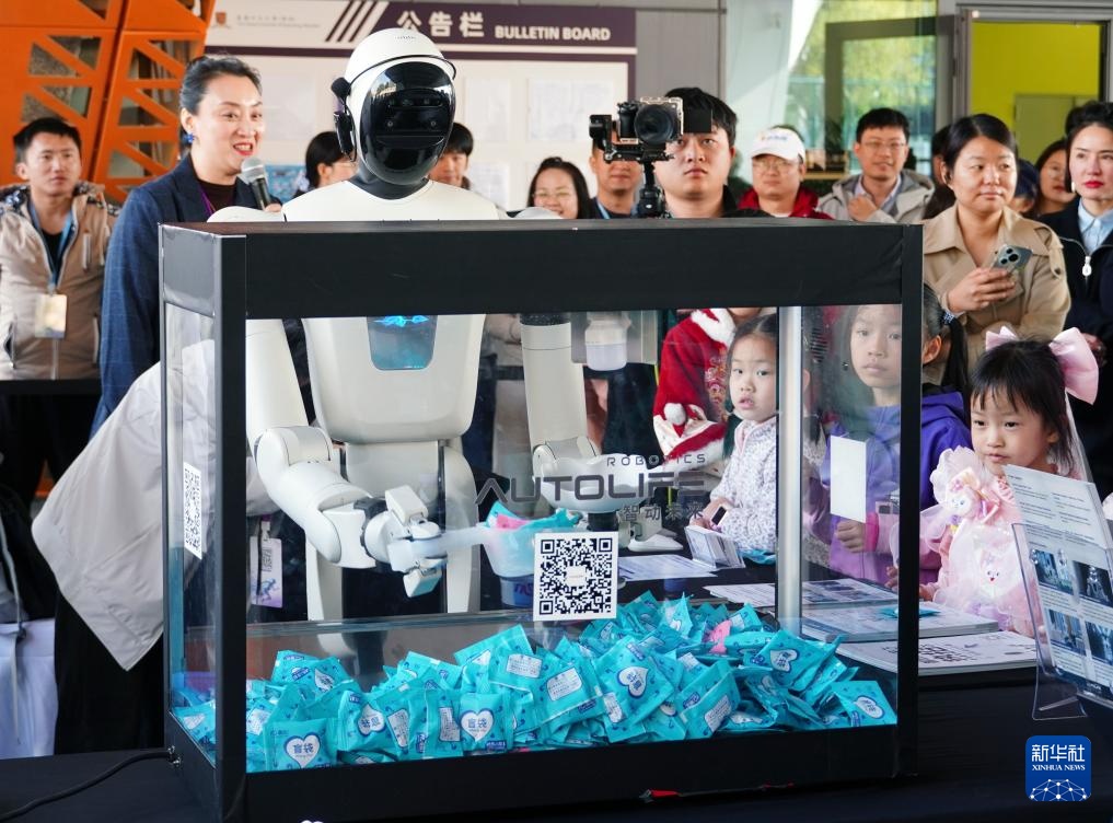 12月27日,机器人为现场观众发放礼品。