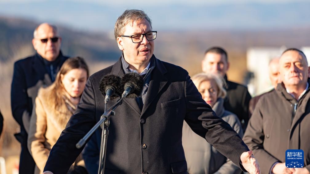 12月29日,在塞尔维亚戈卢巴茨市,塞尔维亚总统武契奇视察“多瑙走廊”快速路项目时发表讲话。