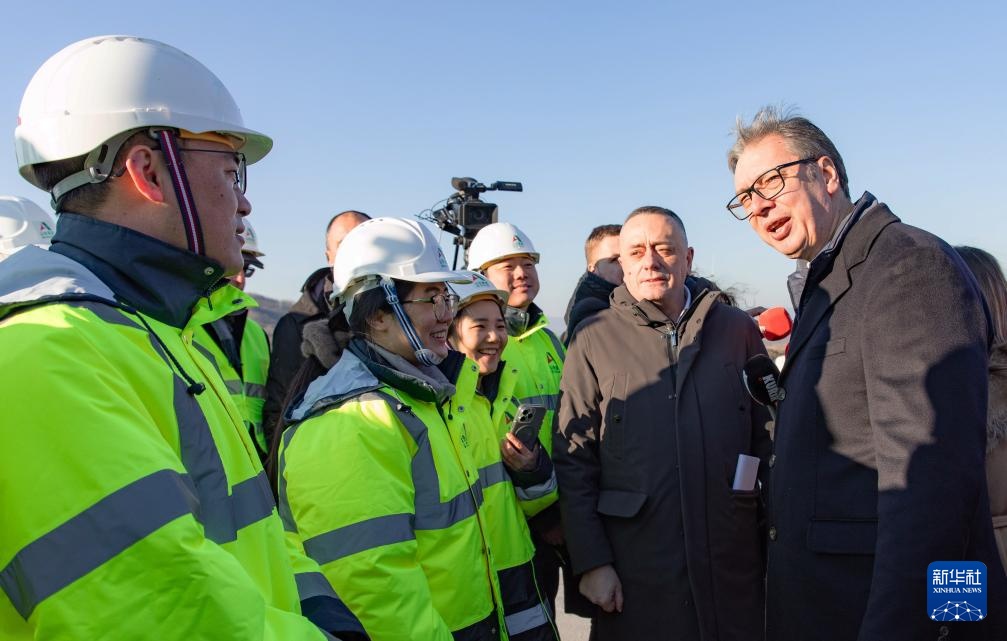 12月29日,在塞尔维亚戈卢巴茨市,塞尔维亚总统武契奇(右一)视察“多瑙走廊”快速路项目时与中方工作人员交谈。