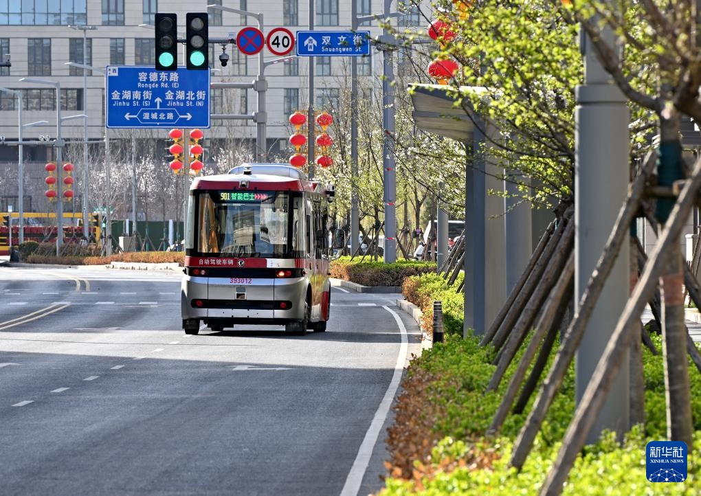 2025年3月27日,智能网联巴士在雄安新区街道上行驶。