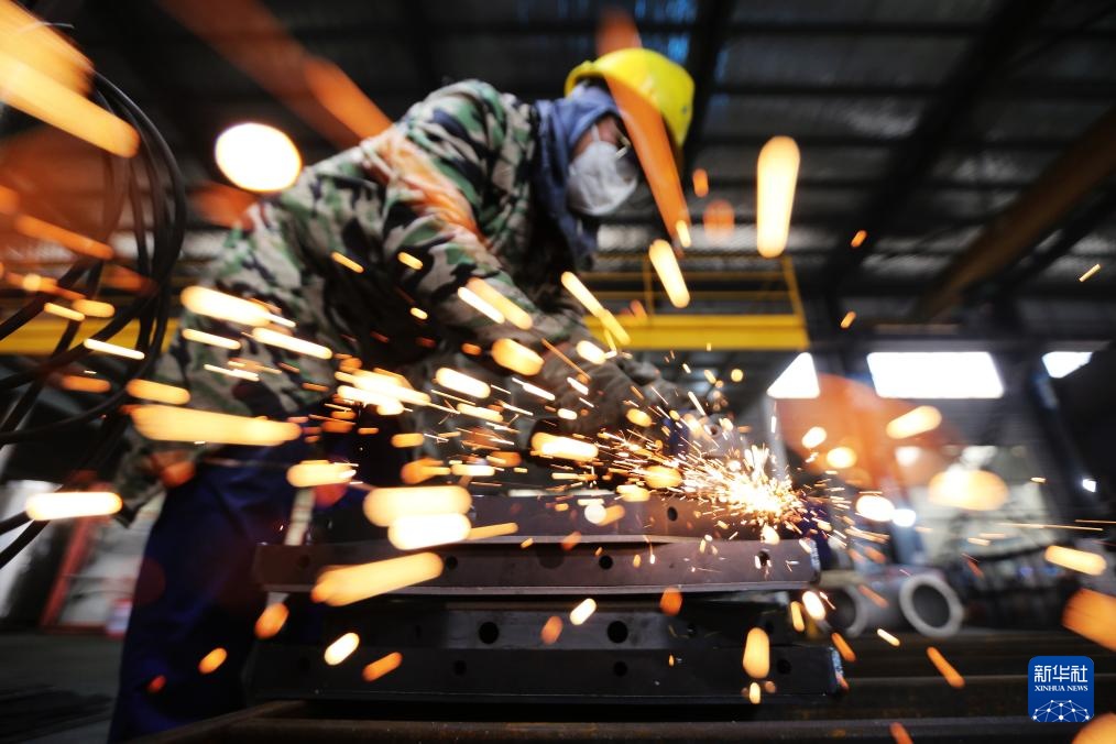 12月29日,江苏省扬州市杨庙镇一家机械制造企业的工人在进行打磨作业。