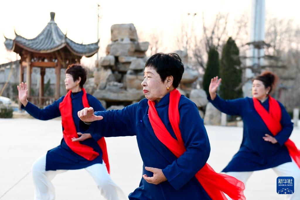 在惠民县淄角镇文化书院广场,社区居民在练习太极拳(12月30日摄)。