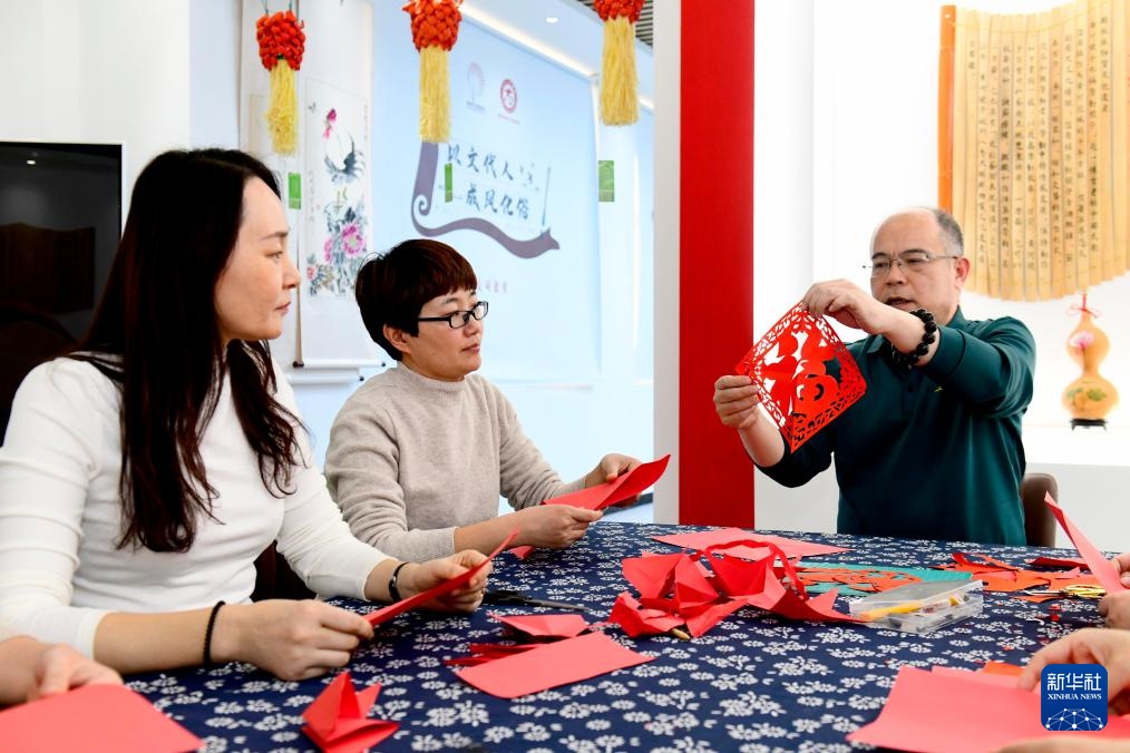 在惠民县淄角镇文化书院,一位老师在教社区居民剪纸(12月30日摄)。