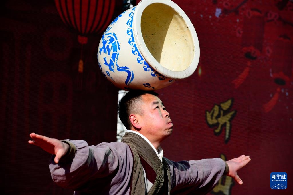 12月31日,在惠民县胡集镇,曲艺艺人在表演杂技《顶缸》。