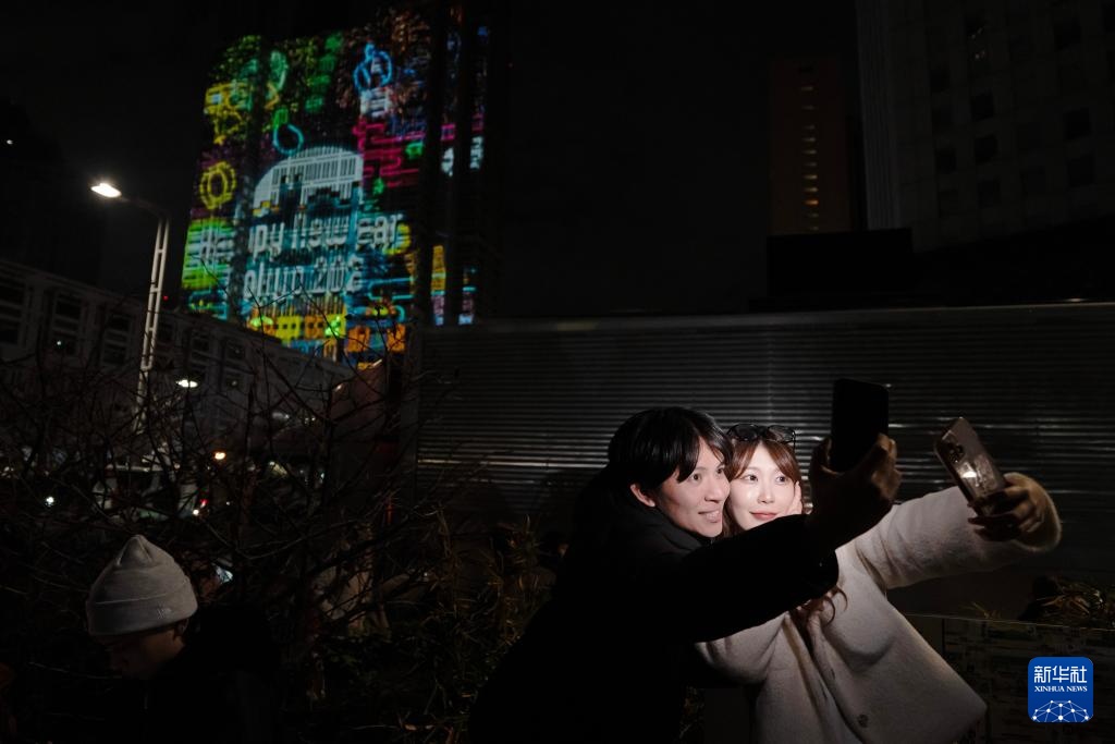 2026年1月1日凌晨,年轻人在日本东京都民广场外拍照庆祝新年到来。