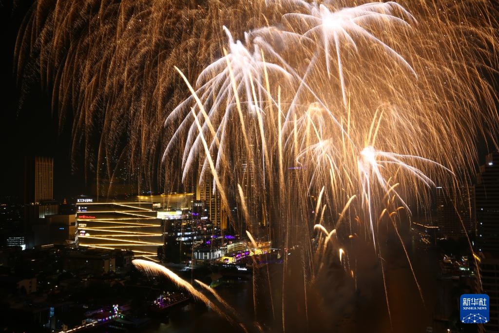 这是2026年1月1日凌晨在泰国曼谷拍摄的湄南河上的跨年烟花。