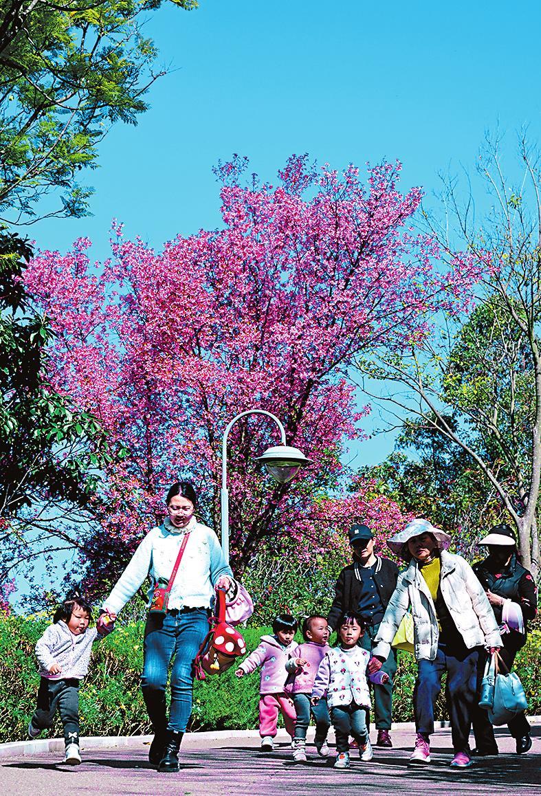 近日,玉溪中心城区冬樱花绚烂绽放,为城市披上了一层淡淡的“粉妆”。红塔体育森林公园内,樱花树错落分布于草坪旁,白色帐篷点缀其间;环山路、龙马路的樱花树沿街道绵延,绘就出城市流动的风景;柴家大山的冬樱花与暖阳相映成趣,勾勒出城市独有的冬日画卷。盛放的冬樱花扮靓了玉溪城,引得市民和游客驻足欣赏,在一城“粉霞”中感受玉溪冬日的独特魅力。 本报记者 李冉 曾永洪 摄(李冉 曾永洪)