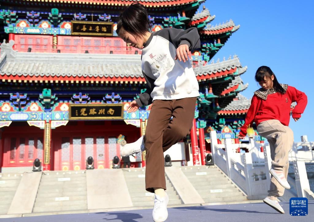2025年12月21日是冬至,在河北省沧州市运河区南川老街,孩子们参加“踢毽暖冬”比赛。