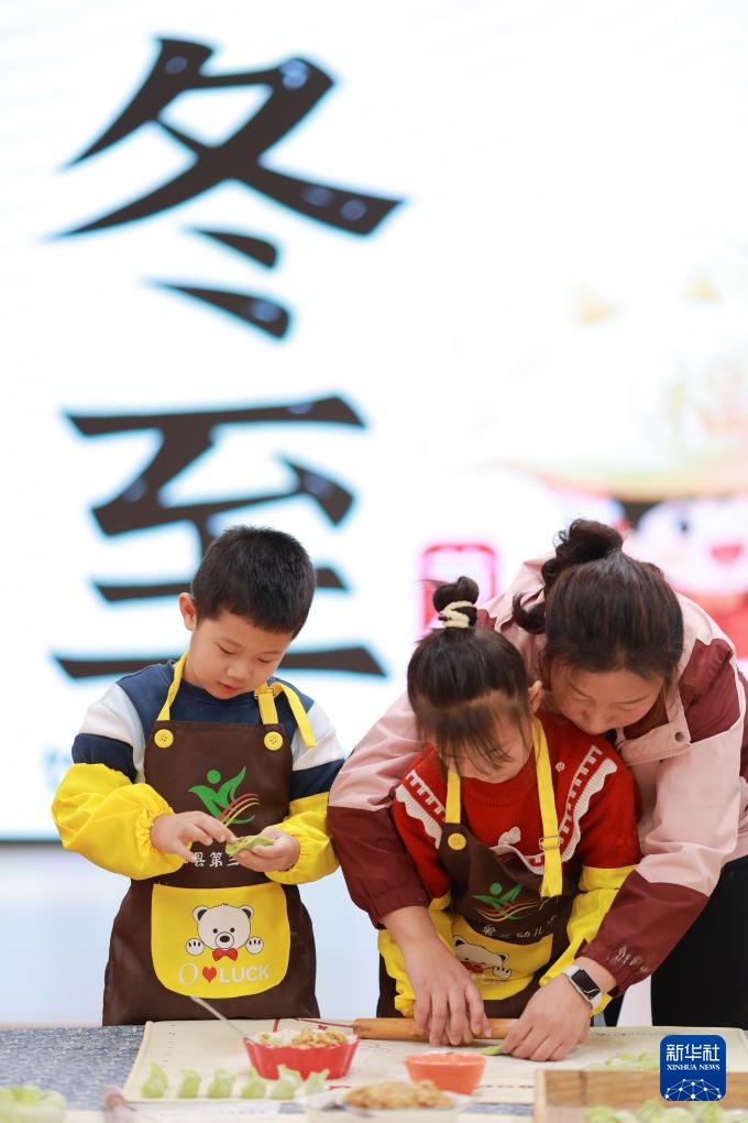 2025年12月19日,河北省邢台市内丘县第三幼儿园的小朋友在老师的指导下学习包饺子,了解冬至民俗。