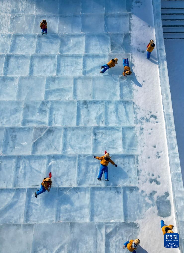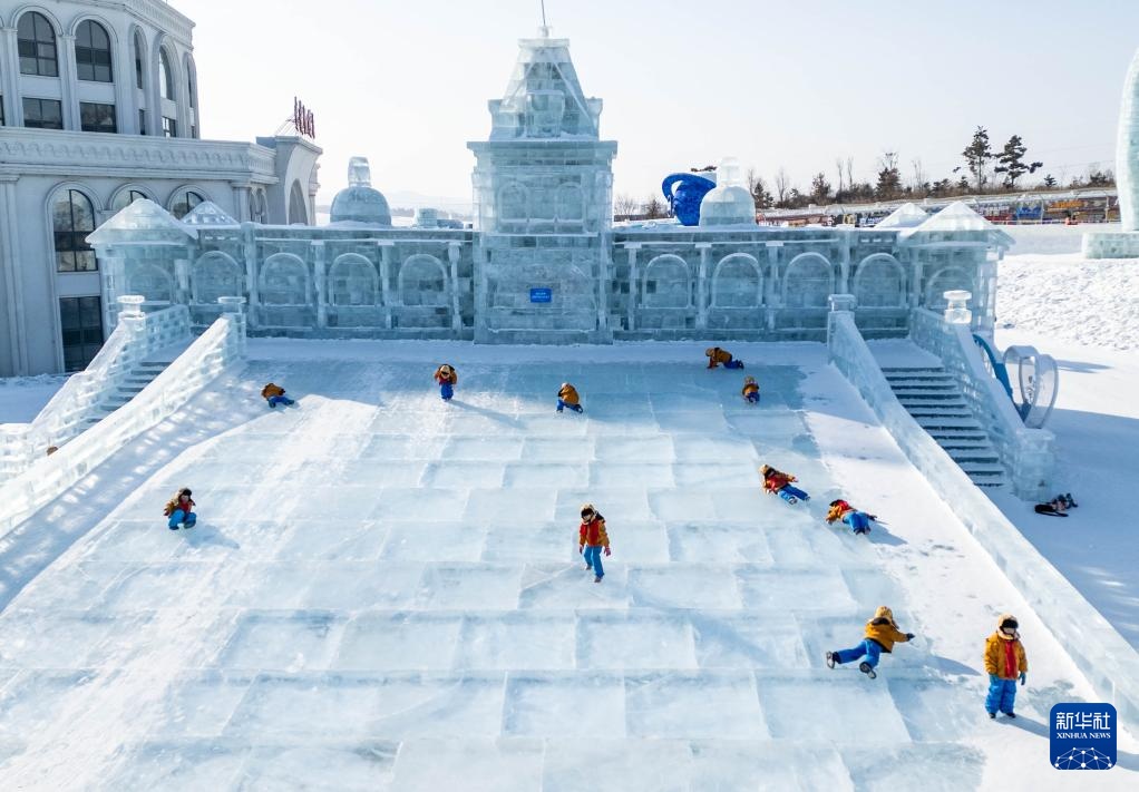 1月14日,广西“小砂糖橘”在位于吉林长春的长春冰雪新天地玩冰滑梯(无人机照片)。