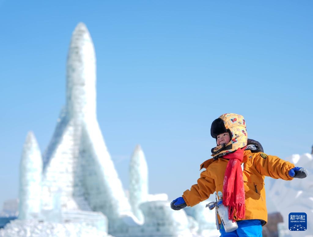1月14日,广西“小砂糖橘”在位于吉林长春的长春冰雪新天地欣赏冰雕。