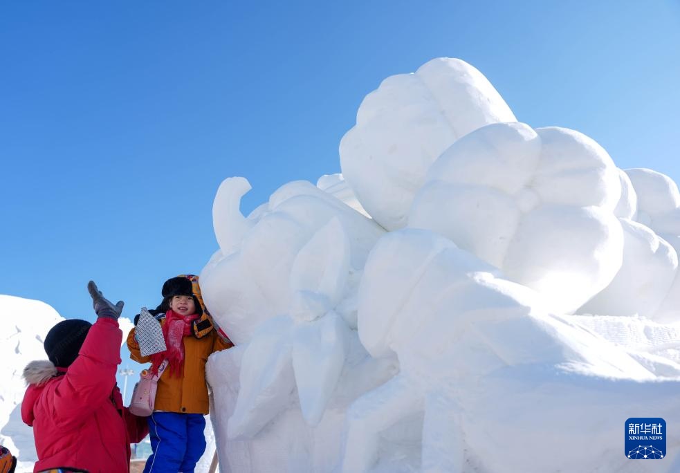 1月14日,广西“小砂糖橘”小朋友在位于吉林长春的长春冰雪新天地体验雪雕制作。