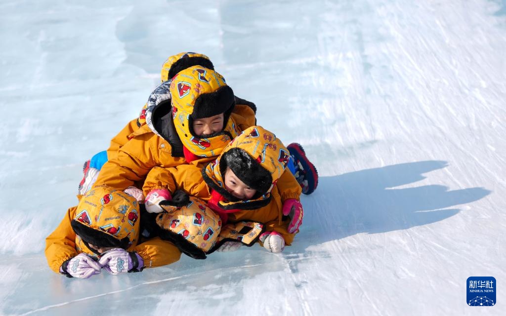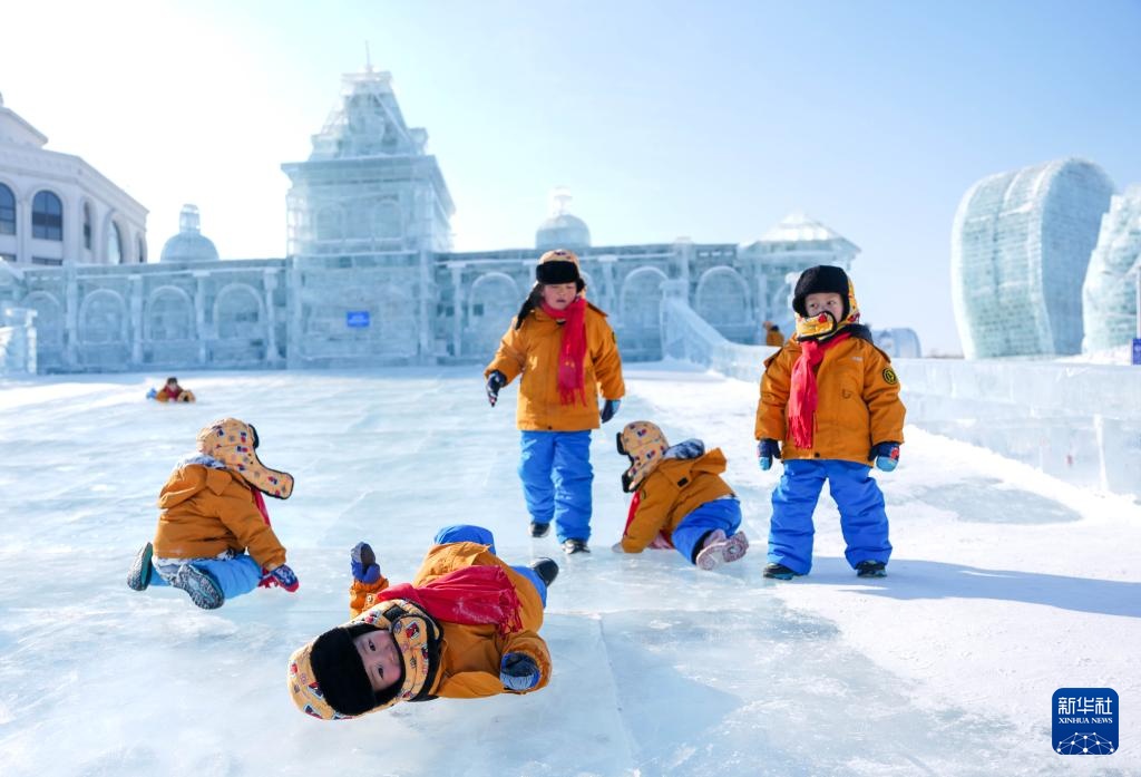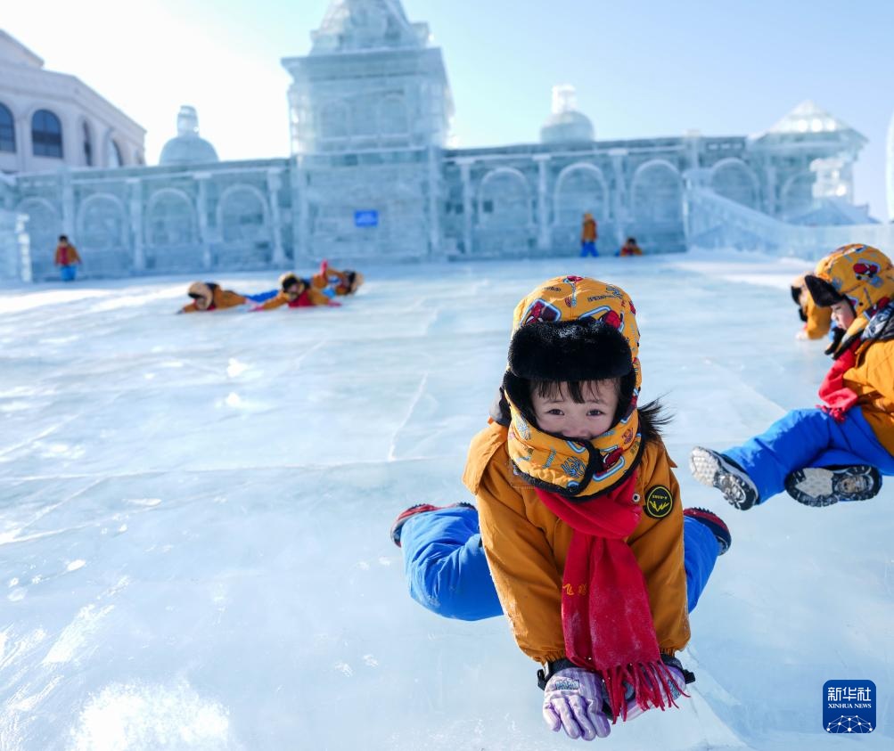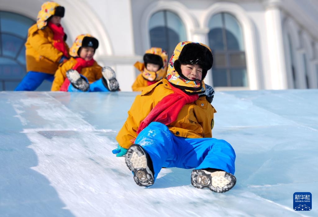 1月14日,广西“小砂糖橘”在位于吉林长春的长春冰雪新天地玩冰滑梯。