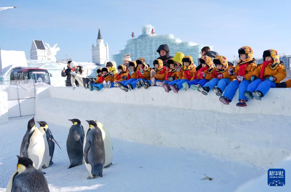 1月14日,广西“小砂糖橘”在位于吉林长春的长春冰雪新天地观看企鹅。
