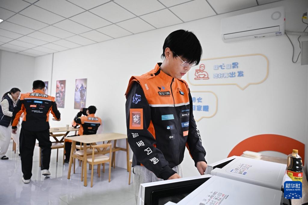 1月14日,在青岛市李沧区“青暖红骑之家”,骑手在共享食堂准备吃午餐。