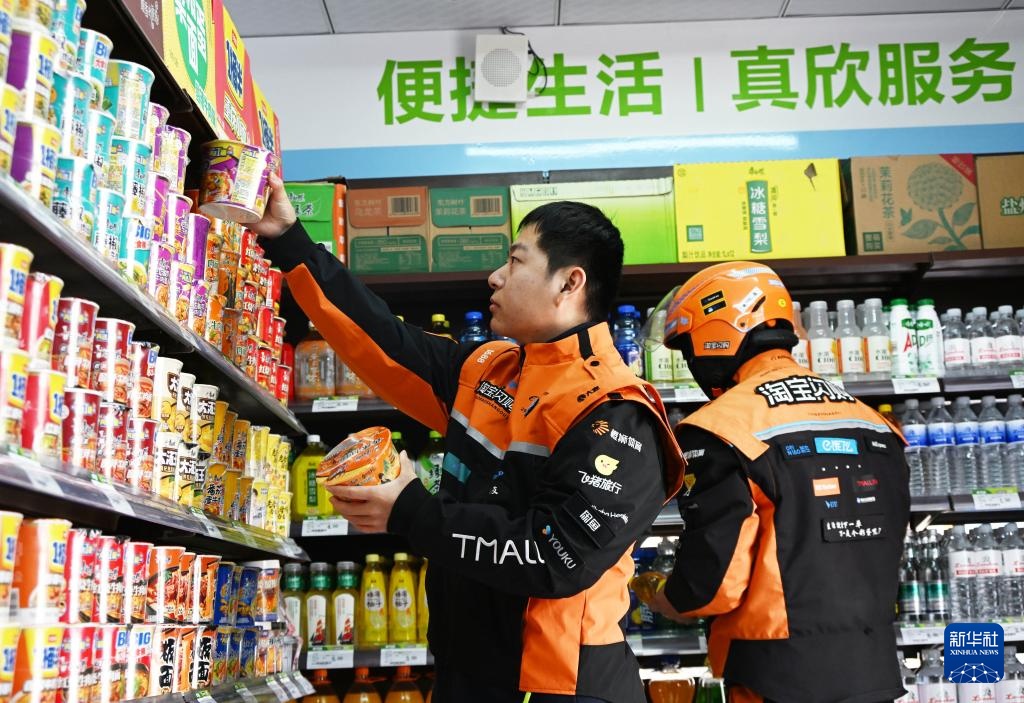1月14日,在青岛市李沧区“青暖红骑之家”,骑手在超市内选购商品。