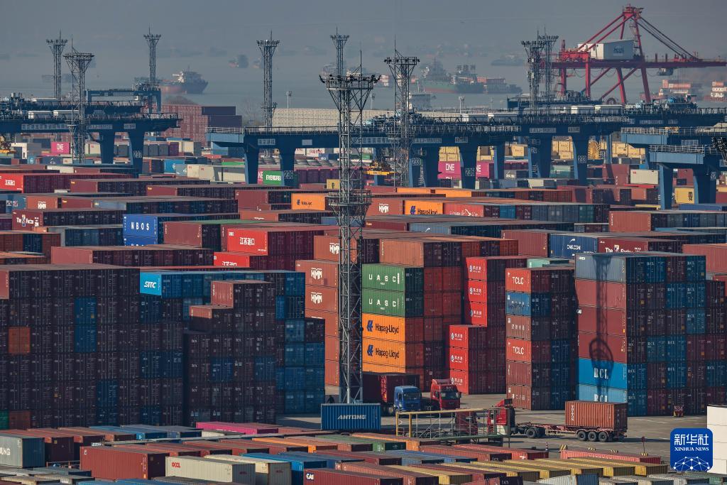 1月14日拍摄的江苏连云港港集装箱码头外贸装卸作业区(无人机照片)。新华社发(王健民 摄)