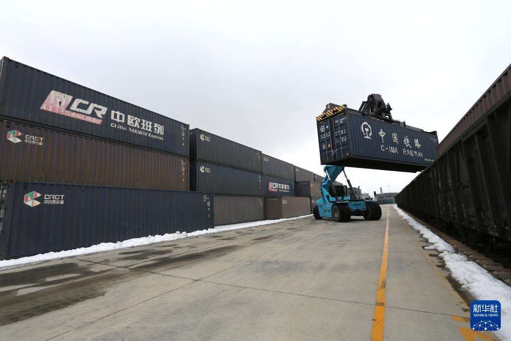 1月14日,车辆在山东省威海国际陆港货场内进行装卸货物作业。新华社发(陈宏青 摄)
