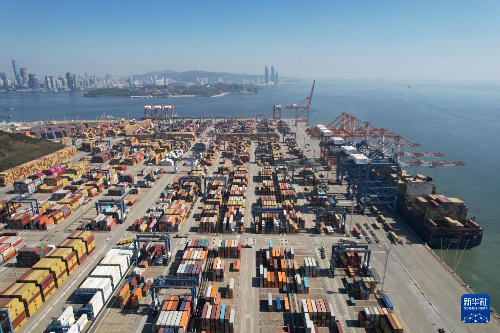 1月14日,货轮停泊在福建厦门海沧嵩屿集装箱码头进行装卸作业(无人机照片)。新华社发(曾德猛摄)