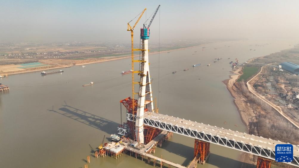 1月15日拍摄的封顶完成的池州长江公铁大桥南主塔(无人机照片)。