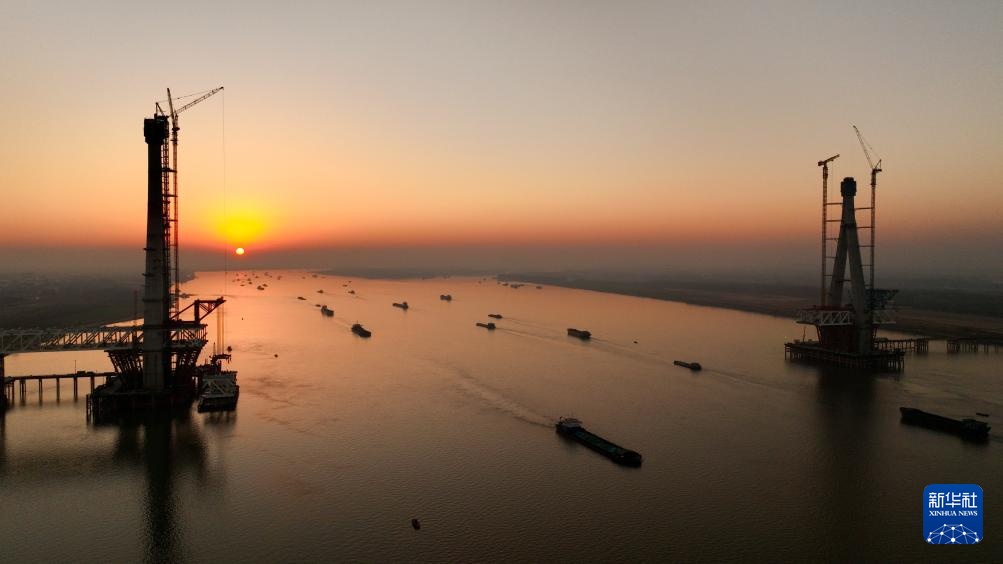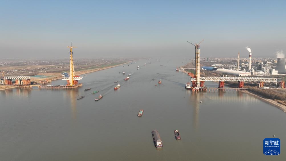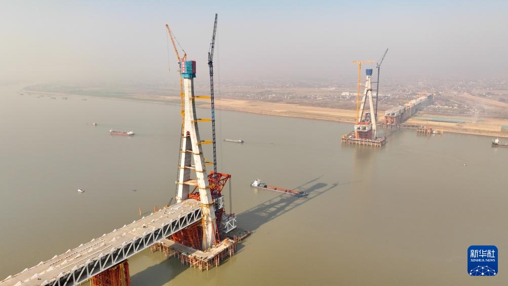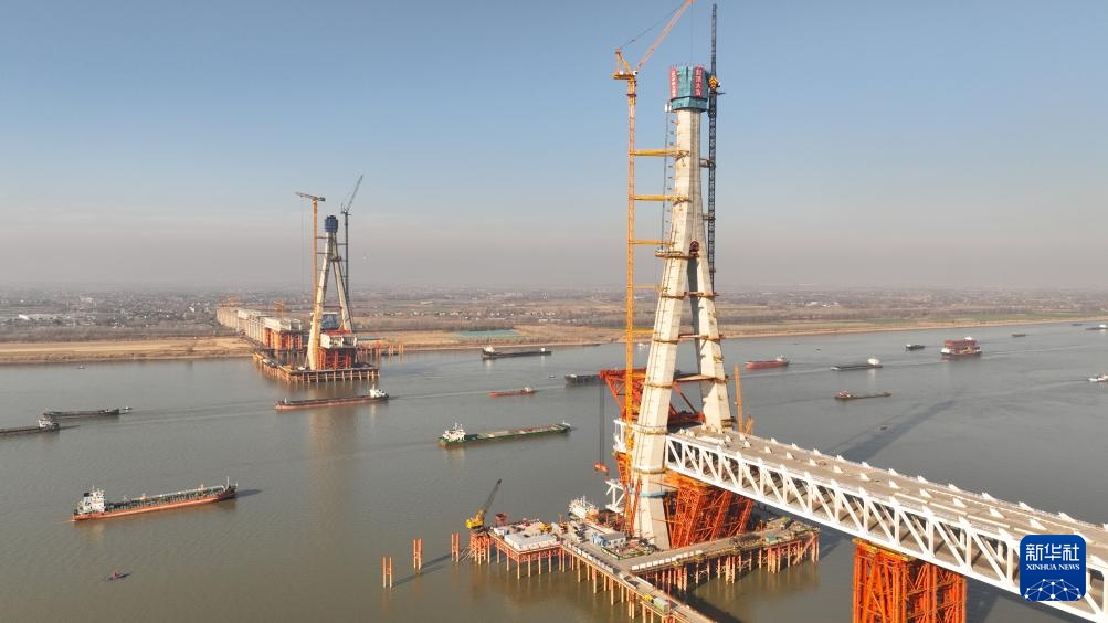 1月14日拍摄的池州长江公铁大桥施工现场。画面左侧为南主塔(无人机照片)。