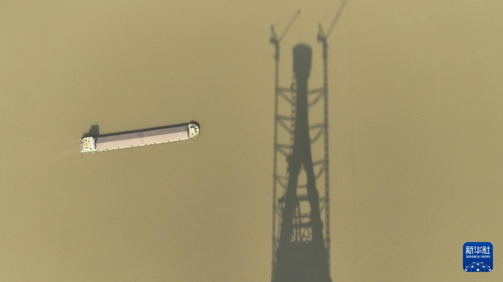 1月15日,封顶完成的池州长江公铁大桥南主塔影子倒映在长江江面上(无人机照片)。