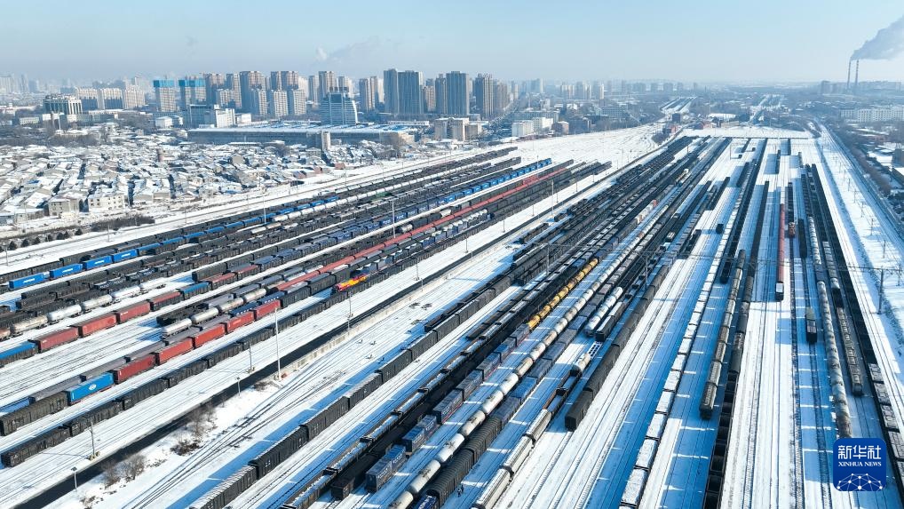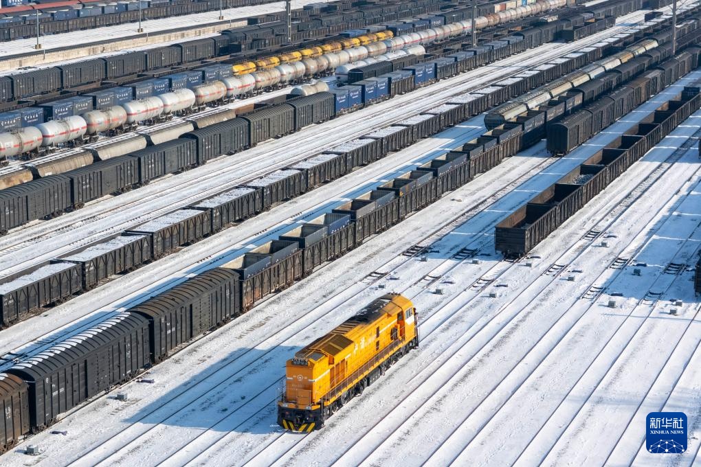 1月15日,装满物资的货运列车在黑龙江省哈尔滨南站编组站场整装待发(无人机照片)。