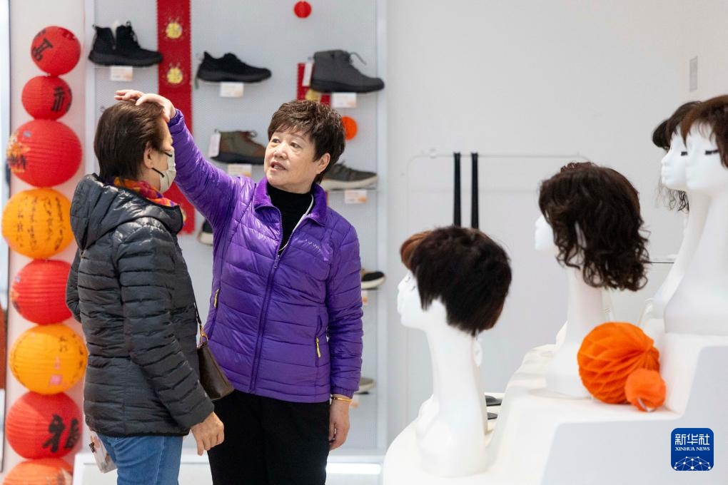 1月15日,上海银发商店的工作人员为顾客推荐假发。