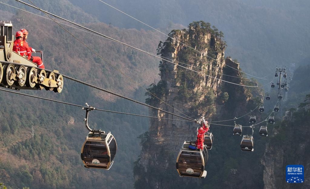 1月15日,湖南省张家界国家森林公园在天子山索道开展冬季高空救援模拟演练,检验索道安全性能及景区各部门快速应变处置能力,保障旅游安全。
