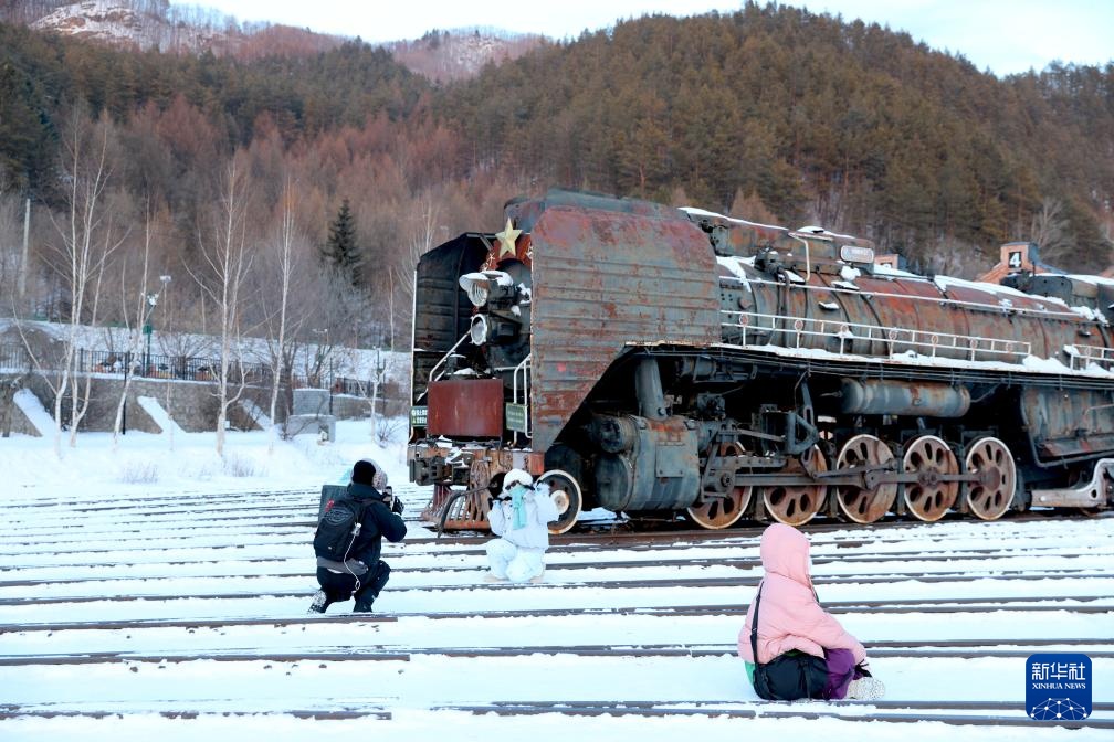 1月15日,游客在横道河子镇中东铁路博物馆机车库展区拍照。