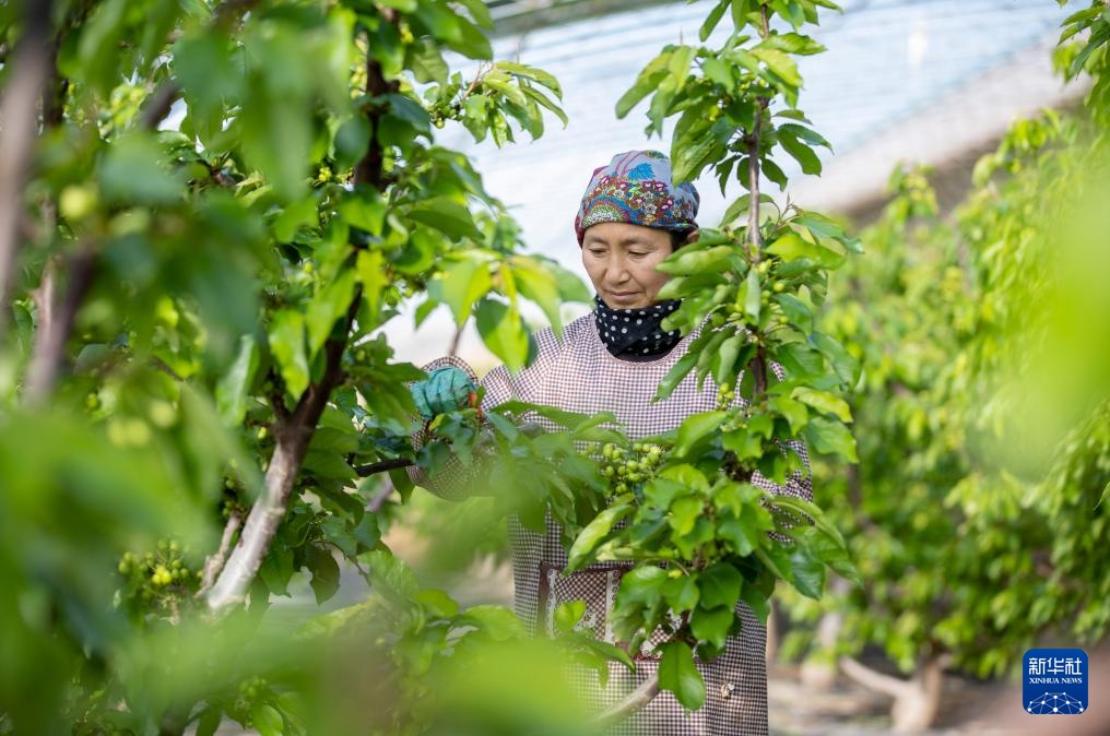 1月15日,农民在位于宁夏银川市贺兰县习岗镇的新平村设施园区樱桃温棚内劳作。