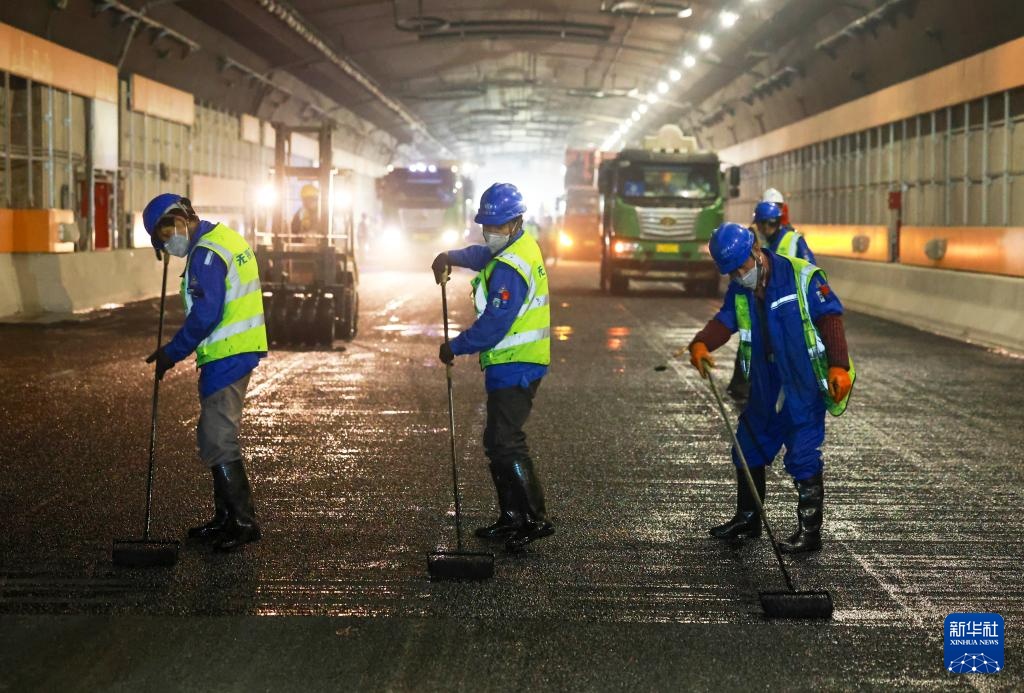 1月15日,施工人员在江苏省靖江市境内的江阴靖江长江隧道建设现场开展路面铺设施工作业。