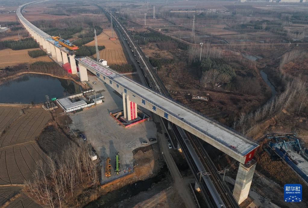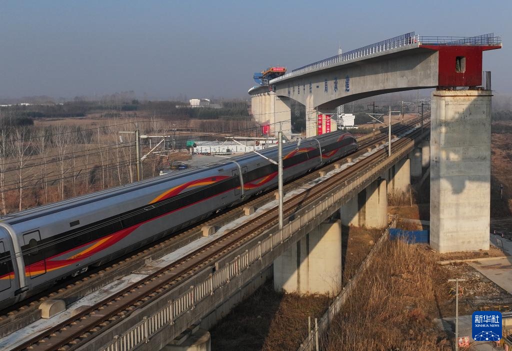 1月16日,行驶在京沪高铁线上的列车穿过沪宁合高铁跨京沪高铁立交特大桥201.5米预应力混凝土T构转体梁(无人机照片)。